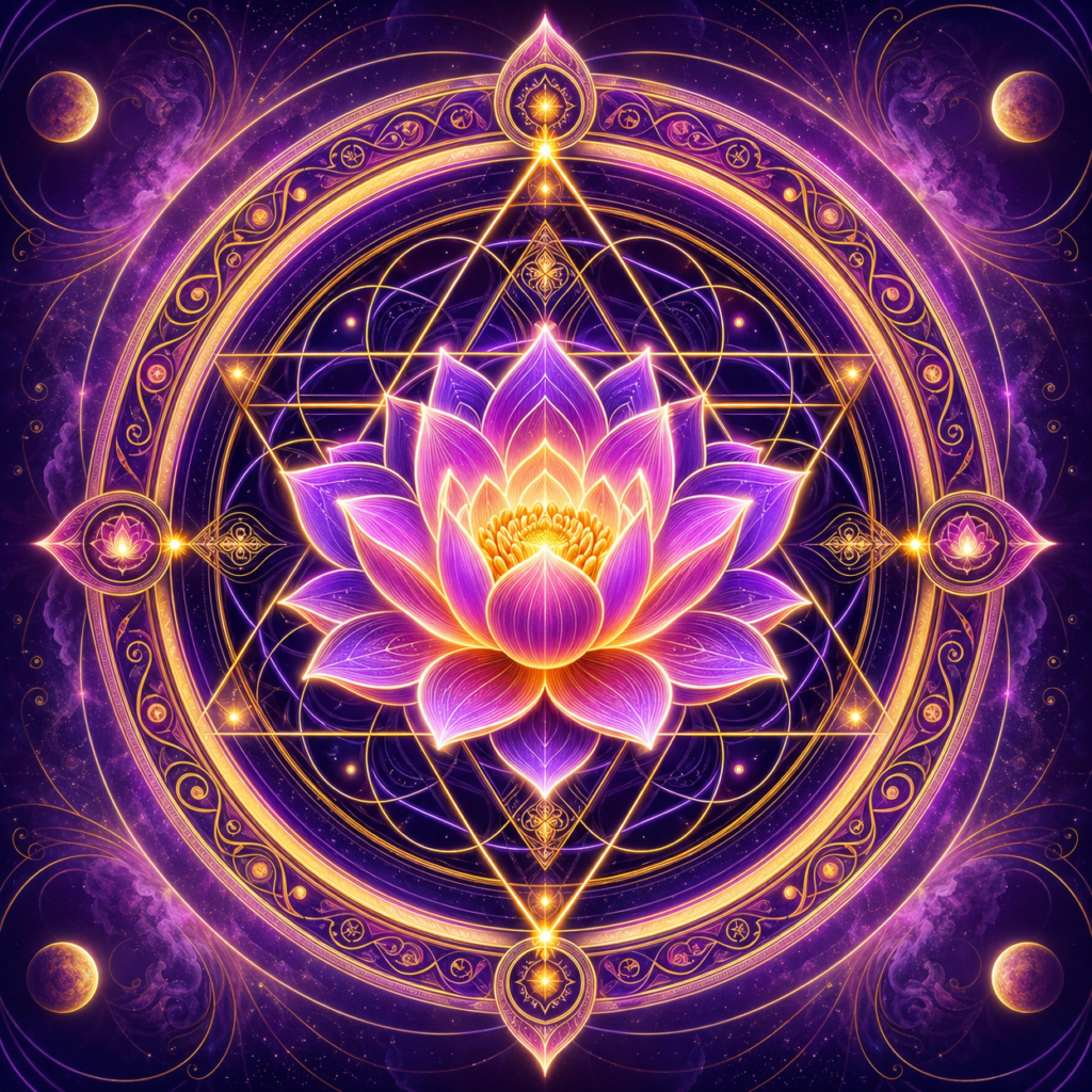 A captivating fusion of sacred geometry and cosmic spirituality. The central, radiant lotus flower represents enlightenment and pure consciousness blooming within a complex grid of interlocking triangles and golden circles, symbolizing universal balance and divinity. Framed by a deep indigo-purple void with planetary orbs and swirling nebulae, this mandala serves as a visual meditation on the infinite nature of the soul and the divine order of the universe.